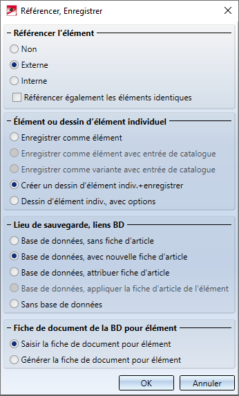 - Sélectionnez-y Référencer Externe, Créer un dessin d'élément indiv.+ enregistrer, Base de données, avec nouvelle fiche d'article et Saisir la fiche de document pour élément. Quittez la fenêtre par OK.