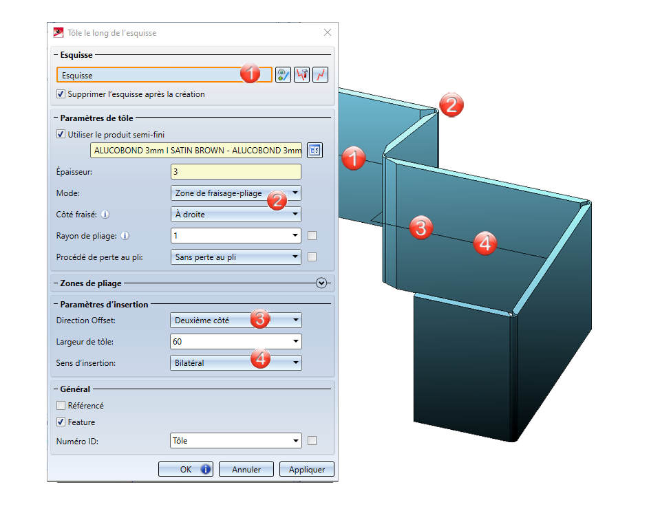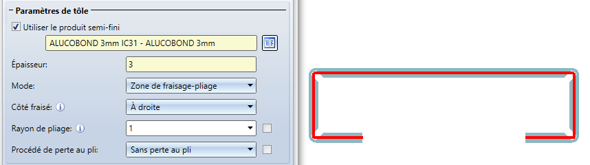 L'option Mode vous permet de choisir entre zone de pliage et zone de fraisage-pliage. La zone de fraisage-pliage est utilisée dans la pratique pour les panneaux composites. Pour le Côté fraisé, qui n'intervient que pour un zone de fraisage-pliage, la direction de l'esquisse est déterminante. Les paramètres sont repris par défaut pour l'ensemble de l'élément de tôle et peuvent être modifiés dans l'encart Zone de pliage ou par le Feature pour chacune des zones de fraisage-pliage.