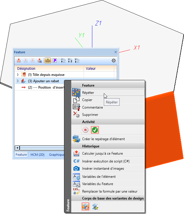 Si vous sélectionnez un rabat de tôle ou une zone de pliage et lancez la fonction par la technique Feature, c'est alors l'élément de niveau supérieur ou l'ensemble qui est activé. Pour les tôles sans Feature, il est permis de déplacer les rabat et les zones de pliage.
