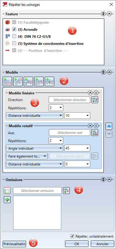 Répétitions : indique combien de fois ce Feature doit être répété. Si l’option Répéter unilatéralement est désactivée, il sera répété dans la direction positive ainsi que dans la direction négative.