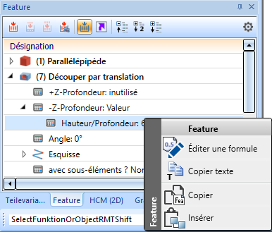 Sélectionnez le parallélépipède. Dans l’historique du Feature, déroulez l’entrée Découper par translation, puis faites un clic droit sur la ligne Hauteur/Profondeur de la valeur -Z-Profondeur. Sélectionnez l’entrée Éditer une formule du menu contextuel.