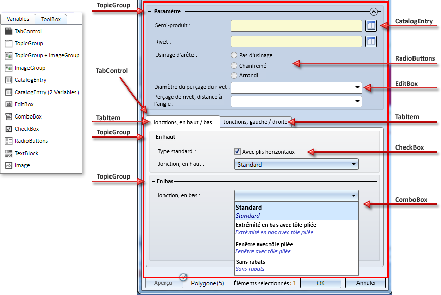 Pour tout objet de la boîte à outils, il est possible de définir des paramètres destinés à influencer l'apparence de l'objet dans le dialogue.