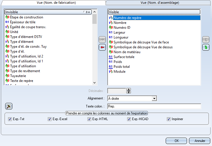 Grâce aux onglets Vue (Nom. d'assemblage) et Vue (Nom. de fabrication), vous pouvez déterminer quelles informations doivent être ajoutées à la nomenclature de fabrication ou d'assemblage. Toutes les colonnes référencées dans la fenêtre Visible seront ajoutées à la nomenclature.
