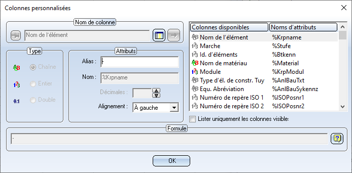 Dans la zone de liste situé à droite de la fenêtre,vous pouvez retrouver un aperçu de toutes les colonnes disponibles ainsi que des noms d’attributs qui y sont affectés. Si vous souhaitez que seules les colonnes visibles dans la nomenclature ouverte soient référencées dans la zone de liste, cliquez sur le bouton Ne lister que les colonnes visibles.