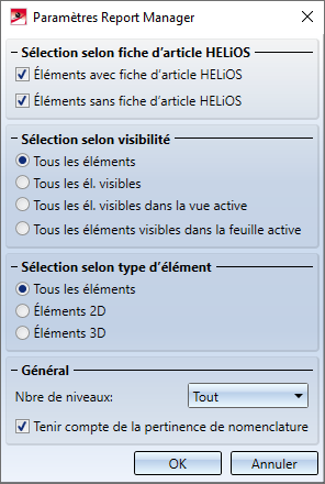 Cochez ou décochez la ou les cases correspondantes afin de déterminer quels éléments doivent être pris en compte lors de la création de la nomenclature :- Éléments avec fiche d’article HELiOS ;