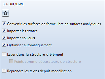 Dans la partie droite de la fenêtre de dialogue, vous pouvez procéder à différents paramétrages pour votre importation. Ces paramètres peuvent être prédéfinis dans le Gestionnaire de Configuration sous Interfaces > Interfaces 3D générales.