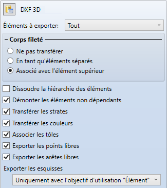 Dans la partie droite de la fenêtre, vous pouvez procéder à différents paramétrages pour votre exportation. Ces paramètres peuvent être prédéfinis dans le Gestionnaire de Configuration ISD sous Interfaces > Interfaces 3D générales. Vous pouvez charger ces paramètres en cliquant sur le symbole