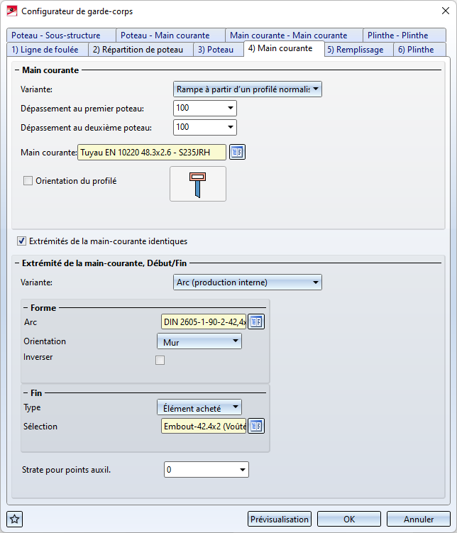 Vous disposez désormais, dans le Configurateur de garde-corps, à partir de l'onglet Main courante, également comme extrémité de main courante d'arcs de tuyau avec/sans embouts ou avec une platine de tôle en acier.