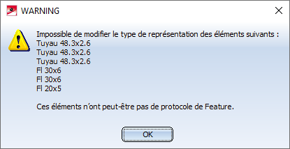 Si une scène contient des éléments dans des représentations différentes, par exemple des escaliers/garde-corps insérés de façon simplifiée via les configurateurs (macros) et en plus des objets de Charpente métallique avec le type de représentation exacte, un recalcul du type de représentation aura alors lieu lors du repérage (positionnement) de la scène dans le cadre d'une recherche d'élément identique. HiCAD vous affiche alors le message suivant :