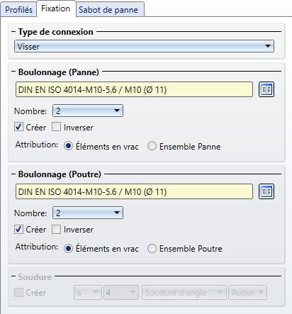 Dans cet onglet, vous sélectionnez la poutre et la panne et vous définissez les dimensions de la jonction de panne.