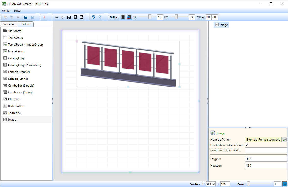Nous voulons tout d'abord insérer une image graphique (par ex. Exemple_Remplissage.png) avec le sous-titre Remplissage planaire. Pour cela, nous activons l'onglet Toolbox, et déplaçons un objet de type Image dans le dialogue et attribuons à l'objet les paramètres souhaités.