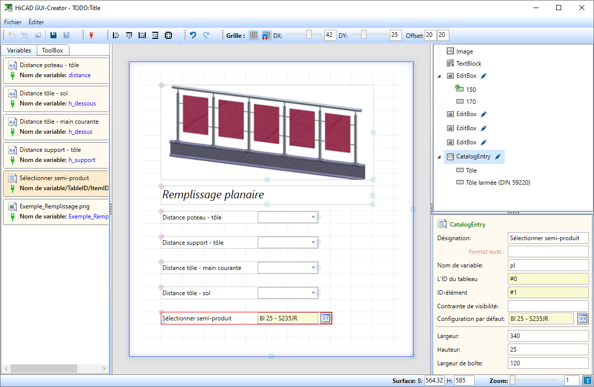 Après avoir créé et sauvegardé en première étape la variante exemple d'un remplissage planaire, et demander de démarrer automatiquement l'Éditeur de dialogue HiCAD, nous pouvons maintenant en deuxième étape créer notre dialogue.