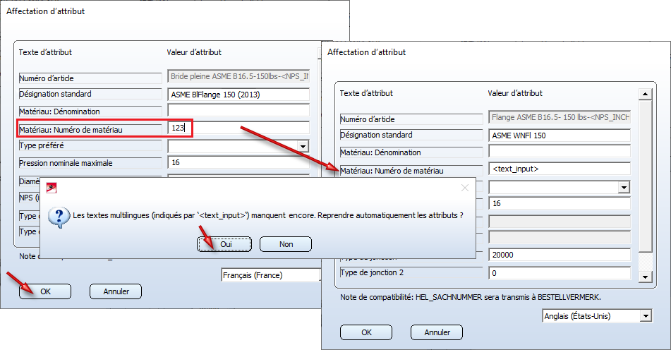 Reprendre les attributs pour toutes les langues Lorsque vous modifiez l'affectation des attributs via le bouton A et que vous cliquez ensuite sur OK sans avoir ajusté l'attribut dans toutes les langues, le message suivant apparaît :