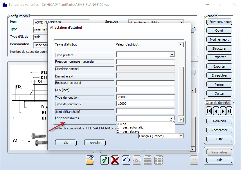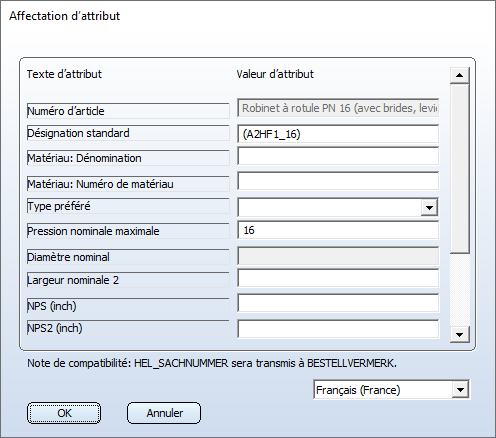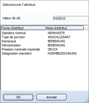 Si d'autres attributs doivent être affichés dans la fenêtre de dialogue Affectation d'attribut, cela peut être effectué en complétant le fichier correspondant nnnnnnn.CatSearchAtt.txt situé dans le répertoire PlantParts\CatSearch du dossier d'installation de HiCAD. nnnnnnn indique ici l'identifiant du type d'élément. Si, par exemple, pour la bride (identifiant du type d'élément 5100010), vous souhaitez voir afficher l'attribut ZUBEHOERSATZ (Code accessoire) dans la fenêtre de dialogue Affectation d'attribut, il vous faut alors modifier le fichier 5100010.CatSearchAtt.txt, en y ajoutant la ligne D:ZUBEHOERSATZ. Résultat :