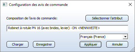 Par un double-clic sur une ligne ou si vous sélectionnez la ligne par un clic gauche et sélectionnez OK, le nom de l'attribut correspondant sera inséré entre parenthèses <> à la position actuelle du curseur dans le champ de saisie du dialogue de configuration du Numéro ID. Le nom est un espace réservé pour la valeur réelle de l'attribut. Si vous cliquez sur Enregistrer (ou par CTRL+S), le contenu du champ de saisie sera enregistré dans un fichier en tant que configuration du Numéro ID, à condition que cette séquence de caractères n'existe pas encore. Pour chaque type d'élément, un fichier correspondant existe dans le sous-répertoire PlantParts\CatSearch, par exemple 1010011.DesignationConfig.txt. Vous pouvez sélectionner encore une autre des configurations de Numéro IS qui sont sauvegardées pour les configurations de Numéro ID actuelles. Cliquez sur Charger (ou utilisez CTRL+L), puis faites un double-clic sur une ligne ou sélectionnez la ligne avec un clic gauche et sélectionnez OK. La configuration correspondante est alors indiquée dans le champ de saisie. Lorsque vous cliquez ensuite sur Appliquer, il vous sera tout d'abord demandé si vous souhaitez enregistrer la configuration du Numéro ID saisie dans le champ de saisie, si elle n'a pas encore été enregistrée. Si vous cliquez maintenant sur le bouton des attributs constants |