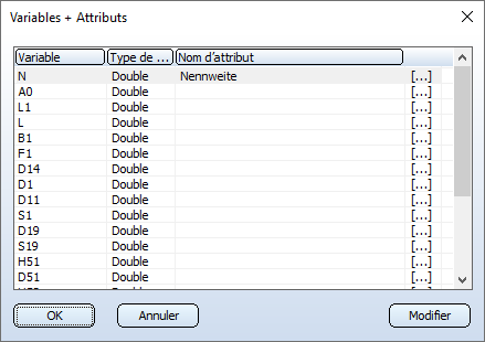Si vous cliquez sur le bouton Variables+Attributs, toutes les variables définies dans la variante seront listées, avec leurs types de données correspondants (entier, virgule flottante ou chaîne de caractères) et les attributs HELiOS. Vous pouvez modifier le nom des variables, supprimer des variables, insérer de nouvelles variables ou affecter des attributs de base de données aux variables. Pour accéder aux fonctions pour modifier les variables, faites un clic droit sur la ligne de la variable que vous souhaitez modifier. Vous pouvez également activer le menu contextuel via le bouton Modifier. Vous pouvez alors corriger la ligne précédemment sélectionnée. Veuillez noter que la modification ne doit pas se référer à des variables qui ont un effet sur la géométrie de l'élément. Une telle variable peut, par exemple, représenter le poids d'une pièce. Si vous changez le nom d'une variable qui est nécessaire pour la géométrie d'un élément, la variante ne sera plus utilisable. Les noms des variables peuvent également être modifiés par un double-clic sur la ligne correspondante. Pour affecter un attribut de la base de données à une variable, ou modifier une affectation existante, cliquez sur [...] dans la ligne souhaitée. Par un double-clic sur une ligne, ou en sélectionnant une ligne puis en cliquant sur OK, l'attribut correspondant est affecté à la variable. Si vous souhaitez insérer une variable, vous pouvez également adapter le type de données (DBL pour virgule flottante, INT pour entier, STR pour chaîne de caractères). La longueur du nom d'une nouvelle variable ne doit pas dépasser 4 caractères. Lorsque vous quittez la fenêtre de dialogue Variables + Attributs avec le bouton OK, les modifications sont appliquées. Une variable supprimée obtiendra le nom "—" (elle peut toutefois être restaurée en la renommant). La variable ainsi nommée ne sera toutefois complètement supprimée qu'après l'enregistrement de la variante. Elle ne sera visible qu'après une réouverture du fichier. |