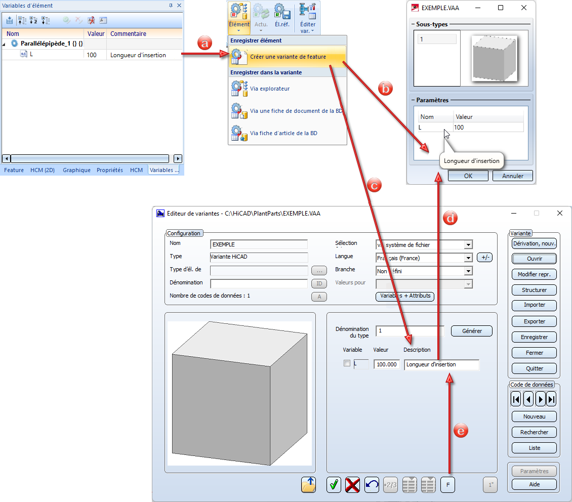 HiCAD permet d'attribuer des commentaires aux variables d'élément ou de Feature afin de les annoter, ce qui peut s'avérer particulièrement utile lorsque les variables sont nombreuses.