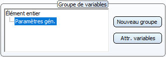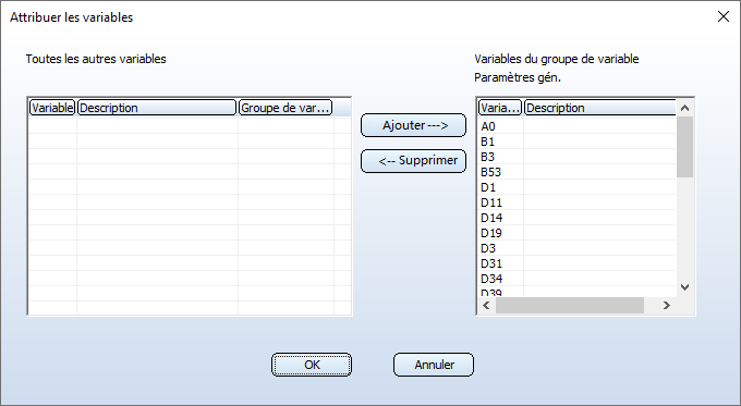 La liste de droite contient les variables appartenant au groupe de variables sélectionné. La liste de gauche contient toutes les autres variables appartenant à l'élément. Cette liste est initialement vide car le groupe Paramètres gén. a été attribué à toutes les variables.