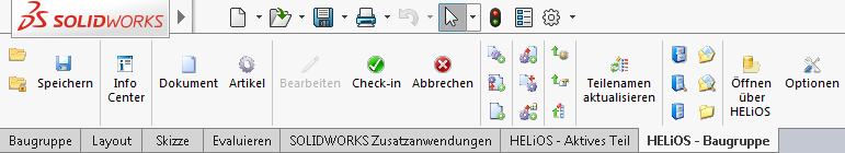 Ist ein HELiOS Dokument in SOLIDWORKS geöffnet, steht in der Oberfläche die HELiOS-Ribbon-Leiste zur Verfügung.