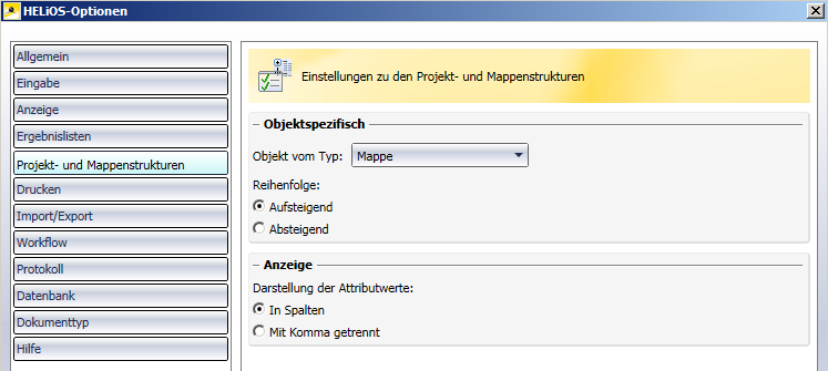 HELiOS-Optionen > Projekt- und Mappenstrukturen