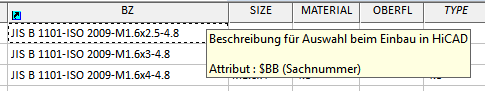 In der Regel ist in den Tabellen für Normteile/Halbzeuge die "BZ" mit dem Teileattribut "$BB" (Sachnummer) verknüpft.