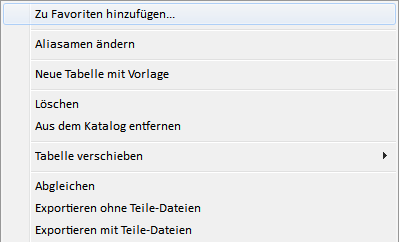 Um schneller auf häufig benötigte Tabellen zugreifen zu können lassen sich diese als Favoriten speichern. Dazu klicken Sie links in der Strukturanzeige mit der rechten Maustaste auf eine Tabelle und wählen im Kontextmenü die Funktion zu Favoriten hinzufügen. Maximal 25 Favoriten sind möglich. Der Zugriff auf die Favoriten erfolgt dann über den Befehl Favoriten im Menü Datei.