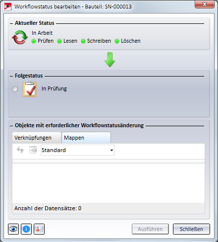 • Besitzt der angemeldete Benutzer keine entsprechenden Rechte zum Ausführen eines Workflowschritt, wird im Workflowstatus-Fenster lediglich der aktuelle Workflowstatus angezeigt, ohne Möglichkeit, ihn zu ändern.