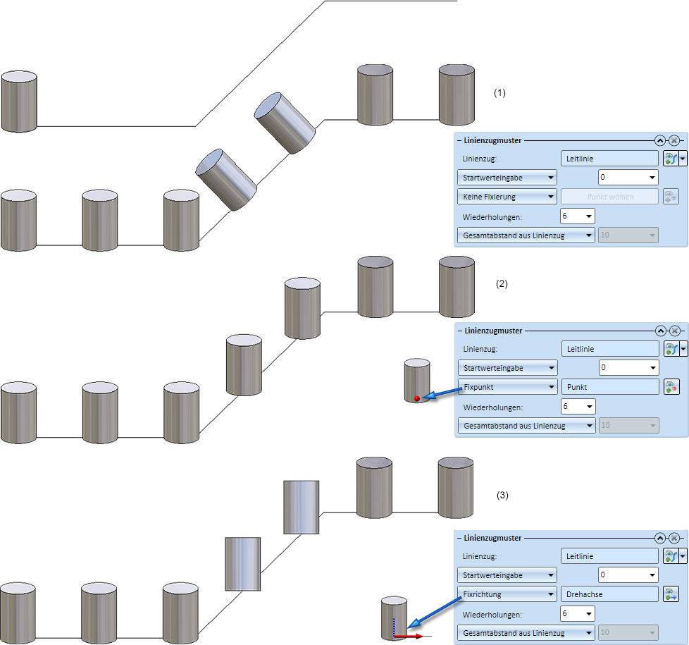 In diesem Beispiel sind Wiederholungen eines Zylinders als Linienzugmuster erzeugt worden. Der abgebildete Linienzug ist eine 3D-Skizze. Es wurden verschiedene Einstellungen verwendet.
