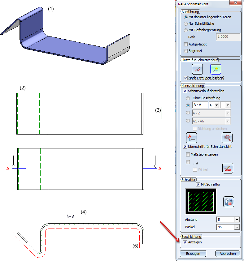 Für Kantbleche kann hier über die Checkbox Anzeigen festgelegt werden, ob die Beschichtung in der Schnittansicht gekennzeichnet werden soll oder nicht. Die Kennzeichnung erfolgt durch eine Offsetkante, die sogenannte Beschichtungslinie. Zur Darstellung der Beschichtungslinie werden die im Konfigurationsmanagement unter Zeichnung > Beschriftungen > Beschichtungslinie in Schnittansicht festgelegten Einstellungen verwendet.