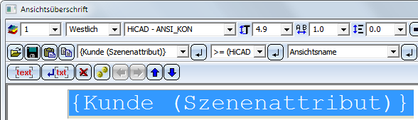 Soll eine Überschrift für die Schnittansicht generiert werden, aktivieren Sie die Checkbox und dann die Einträge, die in die Überschrift übernommen werden sollen. Wird die Schnittansicht beispielsweise nicht in Fluchtrichtung abgeleitet, dann aktivieren Sie den Pfeil und ggf. den Winkel. Wenn Sie eine individuelle Ansichtsüberschrift definieren wollen, klicken Sie auf die Schaltfläche Editieren Die Überschrift wird automatisch über der Ansicht zentriert. Sie haben jedoch nachträglich die Möglichkeit, die Überschrift zu verschieben. Für die Überschrift in Schnittansichten steht die Vorlagendatei VIEWHEADER_S.FTD im HiCAD sys-Verzeichnis zur Verfügung. Mit dieser Datei lassen sich die Überschriften in Schnittansichten individuell konfigurieren. Wird eine Schnittansicht neu erzeugt, dann setzt sich die Überschrift der Schnittansicht zusammen aus den in der Vorlagendatei gewählten Einstellungen, der Ansichtsbezeichnung und den im Dialogfenster für Schnittansichten gewählten Überschriftskomponenten Maßstab, Pfeil und Wiinkel. Ein Beispiel: Für die Vorlagendatei VIEWER_S.FTD wurde die abgebildete Einstellung gespeichert.