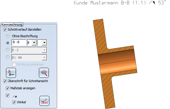 Nun wird eine Schnittansicht mit den nachfolgend abgebildeten Einstellungen erzeugt. Dann enthält die Schnittansicht z.B. die abgebildete Überschrift.