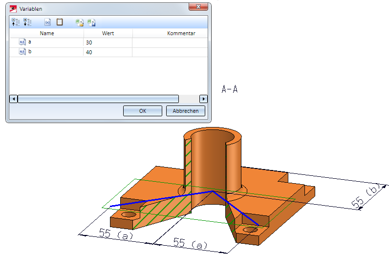 Aus der axonometrischen Ansicht ist eine Schnittansicht auf Basis der Skizze abgeleitet worden (Beispiel). Parallel dazu hat HiCAD automatische die Ansichtsvariablen erzeugt,