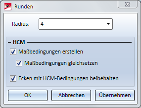 1. Da alle Rundungen identisch sein sollen, vergeben Sie nun die Maßbedingung Radius gleichsetzen für die nicht bemaßten Rundungen.