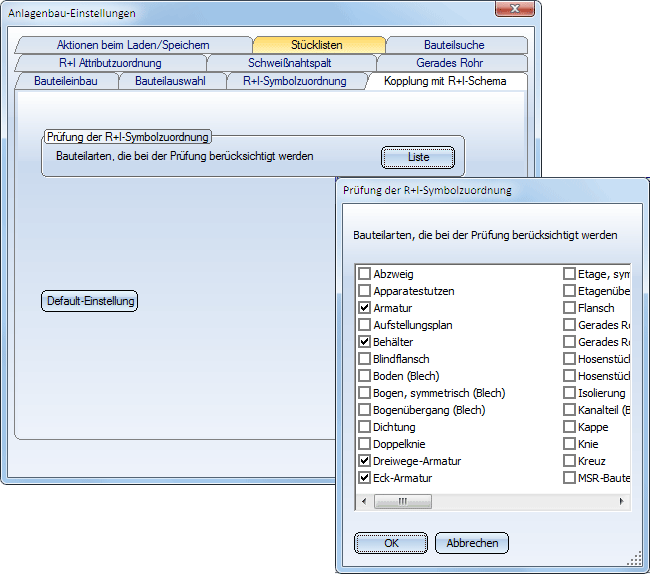 Hier legen Sie fest, welche Bauteilarten bei der Prüfung der Symbolkopplung berücksichtigt werden. Klicken Sie dazu auf die Schaltfläche Liste, aktivieren Sie im Dialogfenster Prüfung der R+I-Symbolzuordnung die gewünschten Checkboxen und beenden Sie das Fenster mit OK.