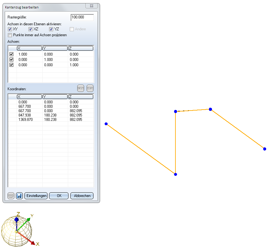 Anhand dieses Beispiels soll die Wirkung der Checkbox Punkte immer auf Achsen projizieren des Leitkantenzugeditors verdeutlicht werden.