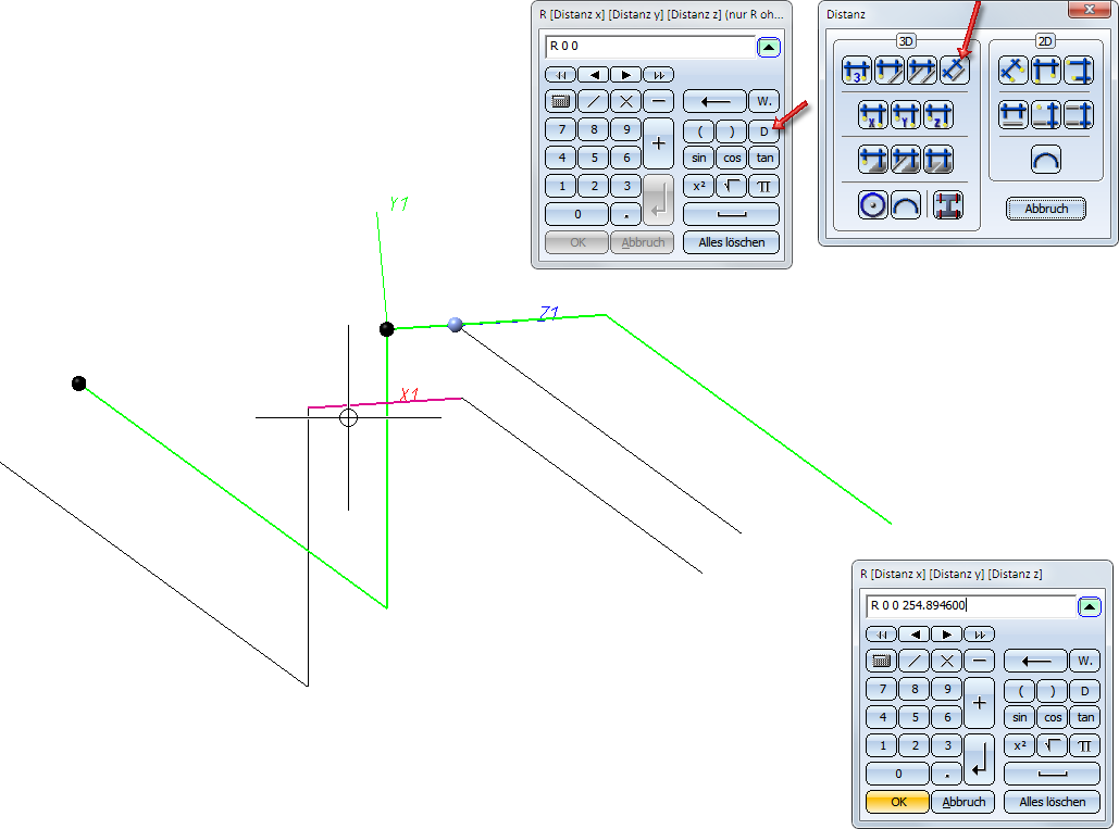 Legen Sie den Zielpunkt relativ zum Anfangspunkt der Diagonalen fest. Wählen Sie dazu die Punktoption Relativ (R auf der Tastatur), drücken Sie die ENTER-Taste und wählen Sie den Anfangspunkt der Diagonalen. Geben Sie dann für die x- und y-Distanz den Wert 0 ein. Die z-Distanz wollen wir aus der Ausgangsrohrleitung übernehmen. Daher klicken wir im Taschenrechner auf D (Distanz), wählen im Distanzmenü die Funktion Kantenlänge und wählen dann die Diagonale des Ausgangskantenzuges.