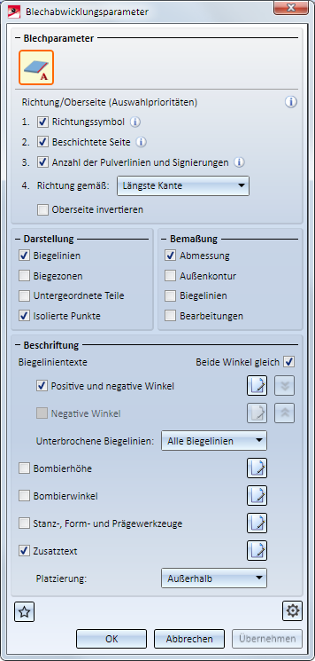 In diesem Dialogfenster legen Sie die Einstellungen für die Abwicklung von Kantblechen fest.