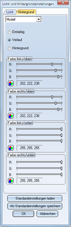 Hier legen Sie den Bildschirmhintergrund - eine Farbe, einen Farbverlauf oder eine BMP-Datei - getrennt für Blatt- und Modellansichten fest. - Licht