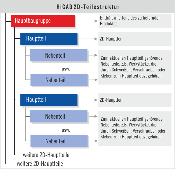 Eine HiCAD Konstruktion besteht zunächst aus 2D- und/oder 3D-Teilen. Dies können Einzelteile oder Baugruppen sein. In HiCAD wird dabei unterschieden zwischen Haupt- und Nebenteilen. Dies ist die Basis für den Aufbau einer sinnvollen Teilstruktur.