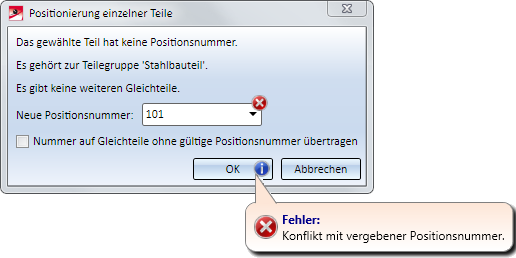 - Wird versucht eine Positionsnummer zu vergeben, die bereits an ein Teil aus einer Teilegruppe mit regelkonformer Nummernvergabe vergeben wurde, dann wird dies im Dialogfenster angezeigt und die Eingabe abgewiesen. Korrigieren Sie dann die Nummer.
