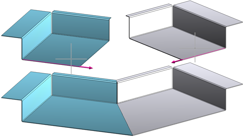 Mit diesem Modus schneiden Sie Bleche und Biege bzw. Fräskantzonen in einem Arbeitsschritt auf Gehrung. Dabei wird die Biegezone entweder angeschnitten oder angepasst. Die Laschen der Bleche können in unterschiedlichen Blech-Hauptteilen liegen.
