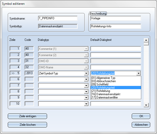 In Ziel-Symbol-Typ kann ein Symboltyp festgelegt werden, auf den ein Datenmaskenobjekt-Filter wirken soll, also beispielsweise nur auf Rohrleitungsteil-Symbole. Die verfügbaren Symboltypen könne aus einer Combo-Box ausgewählt werden: