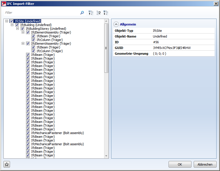 Ist die Option Filter aktiv, wird nach Betätigung von Öffnen ein weiterer Dialog zur Abwahl von IFC-Klassen aufgerufen.