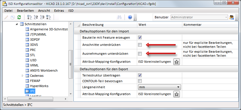 Die Defaulteinstellungen, welche Exportoptionen beim Aufruf des Dialogs aktiviert bzw. ausgenommen sein sollen, können Sie im ISD Konfigurationseditor unter Schnittstellen > IFC vornehmen. Außerdem kann dort für Import und Export ein Attribut-Mapping definiert werden.