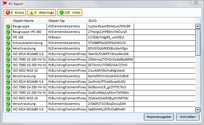Durch einen Klick auf einen Eintrag des Reports werden weitere Informationen zum Objekt angezeigt. Durch einen Klick auf die Schaltfläche Reportausgabe lässt sich das Protokoll als CSV-Datei speichern.