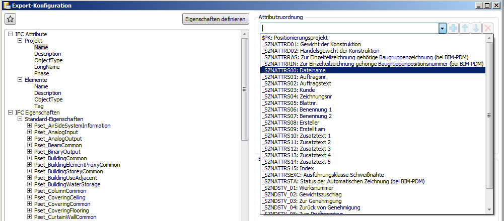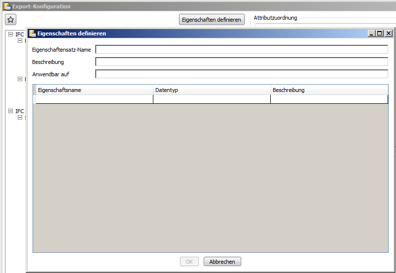 Über den Schalter Eigenschaften definieren können hier zusätzlich zu den Standard-PropertySets des IFC-Formats auch benutzerdefinierte PropertySets angelegt werden.