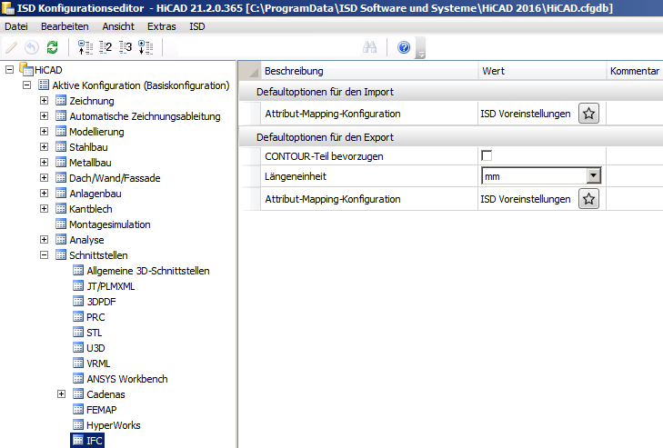 ImISD Konfigurationseditorkönnen Sie neben den Defaulteinstellungen der Exportoptionen (Contour und Längeneinheit) außerdem das entsprechende Attribut-Mapping für Import und Export definieren.