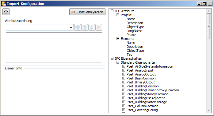 Über den Button IFC-Datei analysieren können Sie außerdem eine vorhandene IFC-Datei auswählen, die daraufhin analysiert wird. Dabei werden ihre individuelle PropertySet-Definitionen zusätzlich in den Baum der IFC-Attribute geladen, die links mit entsprechenden HiCAD-Attributen gemappt werden können.