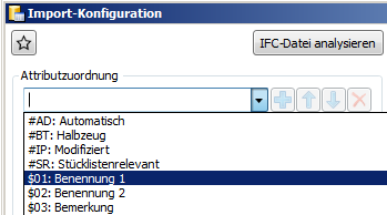 Der +-Knopf ordnet das HiCAD-Attribut dem ausgewählten IFC-Element zu. Werden mehrere Quellen angegeben wird die Liste von oben nach unten abgearbeitet. Die erste Quelle, die einen Wert liefert wird beim Export dem Element zugewiesen.