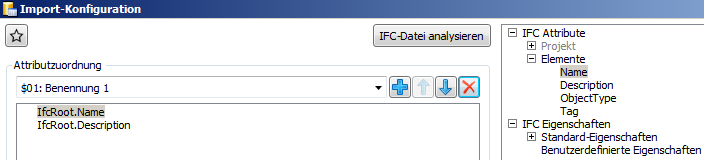 Der +-Knopf ordnet die ausgewählte IFC-Quelle dem ausgewählten HiCAD-Zielattribut zu. Werden mehrere Quellen angegeben wird die Liste von oben nach unten abgearbeitet. Die erste Quelle die einen Wert liefert wird auf das Attribut geschrieben. In folgenden Beispiel-Ausschnitt wurden dem HiCAD-Attribut Benennung 1 die IFC-Attribute Name und Description zugewiesen: